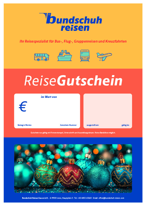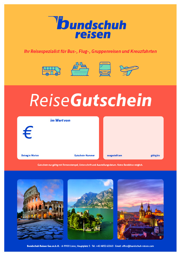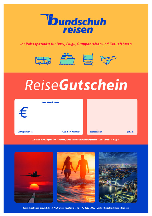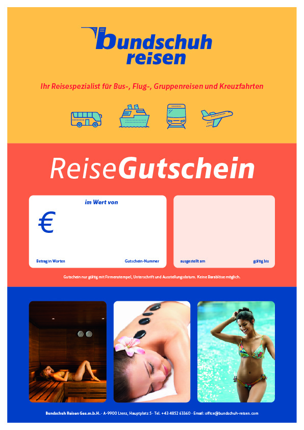 … erhältlich mit Ihrem Wunschbetrag im Reisebüro Bundschuh – Lienz, Hauptplatz 5